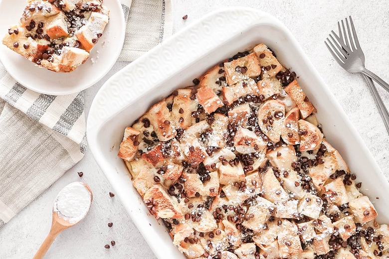 When you're ready to bake the casserole, preheat the oven to 350 degrees Fahrenheit. Top the casserole with the remaining mini chocolate chips, then bake for 30 to 40 minutes or until the bread is golden brown.