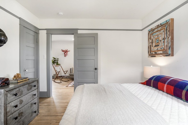 Before you start shopping for doors, first consider the amount of space with which you're working. Basic hinged doors are the most popular type for bedrooms and are very common. They're simple and effective and come in both flush and panel designs. Hinged bedroom doors typically swing into the room when opened, and you'll need enough room to accommodate this.