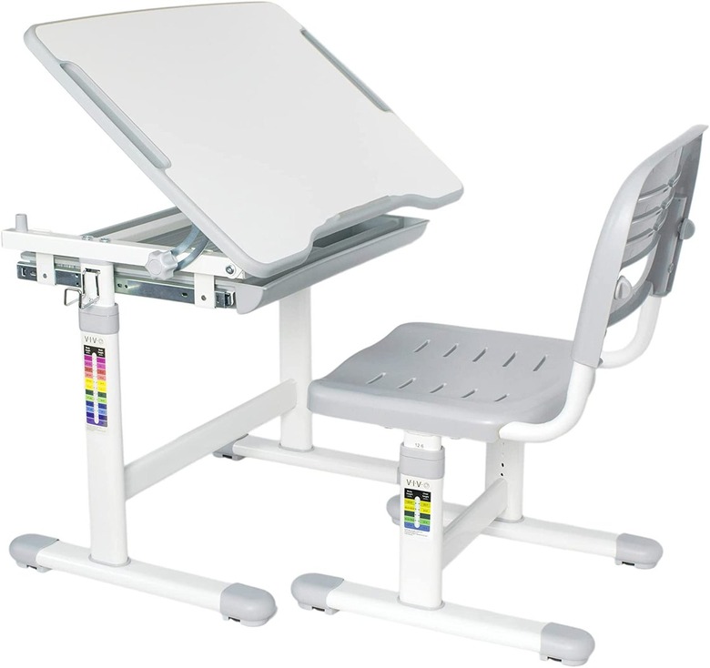 This sturdy desk was designed with ergonomics in mind. Between the height-adjustable table and chair as well as the tilt desktop, your child's comfort is the priority. No slouching here! There's also a pencil tray and storage drawer. This desk set is intended for children ages 3-10.