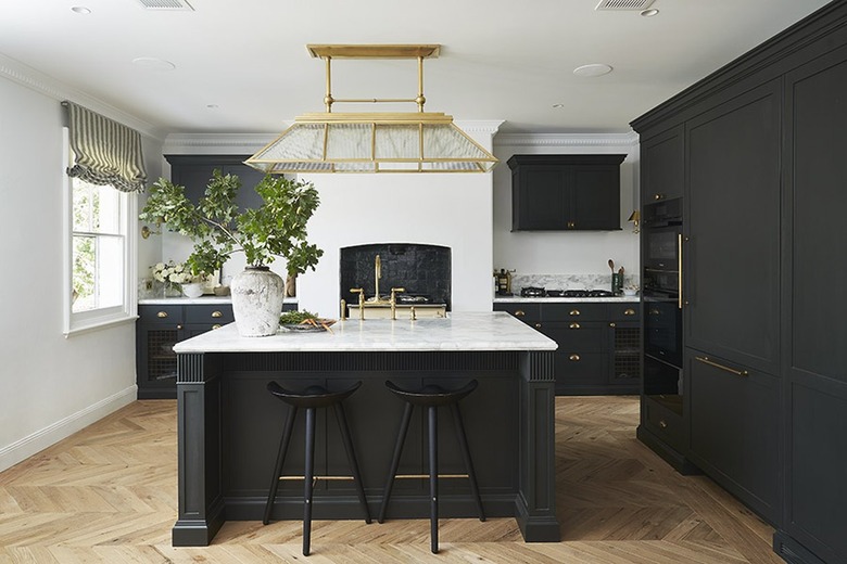 Go for a rich tone-on-tone look like Studio Lawahl did here. The gray cabinets, dark floor, and matching dark wood furniture make this kitchen cozy and classic. Keeping the ceiling and light fixtures white helps draw the eye upward, opening up the room.