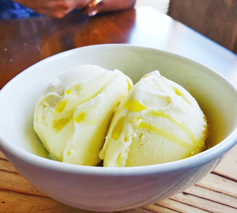 Yes, we're talking about the same oil you probably use to make vinaigrettes and fry omelets. According to fans of the pairing, the richness of olive oil pairs beautifully with the texture of ice cream. What's more, the savory notes of olive oil complement the ice cream's sweetness, resulting in a decadent dessert.