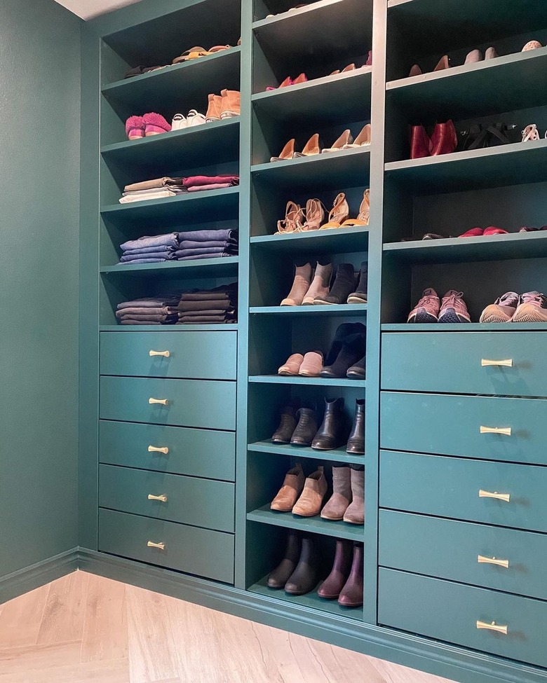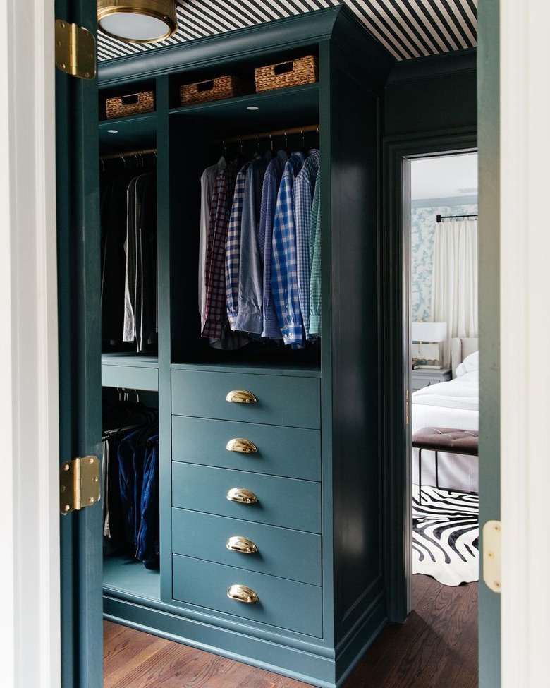 We are head over heels for this jewel tone (which is Farrow & Ball's Inchyra Blue), created by user @erinkestenbaum in an IKEA Pax closet. To upgrade the system, they added puck lights, baseboards, wood trim, Emtek brass cup drawer pulls, and drawer fronts, all of which you can read more about here.