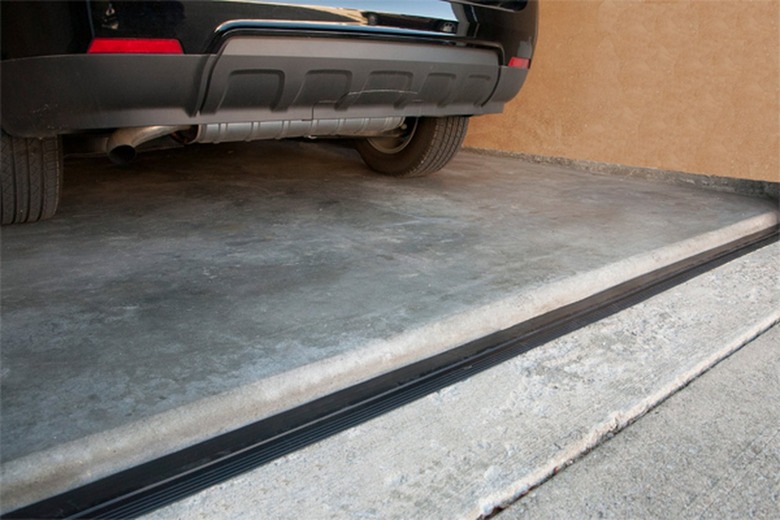 A garage door threshold is a strip of waterproof material sealed to the garage floor directly under the door that runs along the width. Typically 3 to 4 inches wide, it tapers from floor level on both sides to rise to a height between 1/2 inch and 2 inches. The best height for your garage depends on the amount of gap between the bottom of the door and the floor as well as the severity of any water incursion problem you might have. Most thresholds have a groove in the top into which the garage door bottom seal fits, so when the door is closed, the combination forms an effective garage door threshold seal.