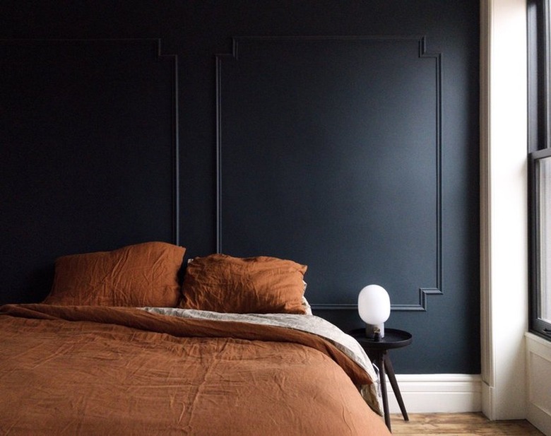 Despite its earthy origin, don't overlook rust as a color palette option in sophisticated spaces. For an elegant take on the shade, pair it with matte black walls and warm wood flooring. The team at Shapeless Studio executed the look flawlessly in this bedroom design complete with burnt-orange colored linens and picture frame molding on the walls.