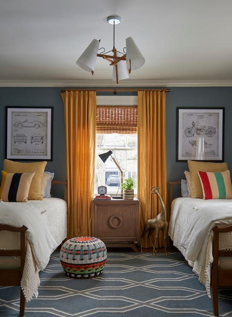 If your gray walls have a blue undertone, try pairing them with deep mustard yellow curtains like Lovejoy Interiors did here. Blue and yellow are naturally complementary, since they sit opposite each other on the color wheel, but these two shades make a particularly delightful paring. The woven pull-down shade and wooden bed frames help lighten the feel of the room, while the colorful throw pillows are an easy way to incorporate other bright colors into the space.