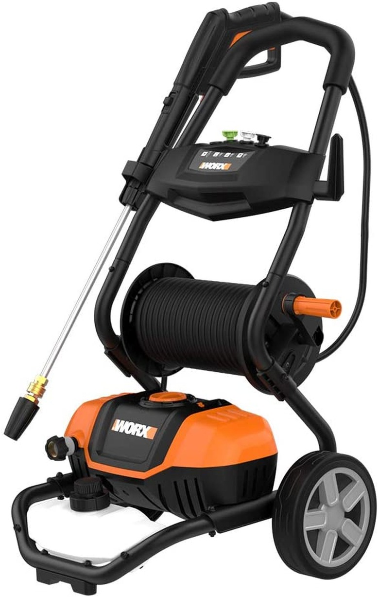 The budget-friendly Worx WG604 has 1,600 PSI making it most appropriate for light cleaning tasks. It comes with four nozzles, including 25°, 40°, turbo, and soap. It has a durable design and eight-inch wheels for ease of use.