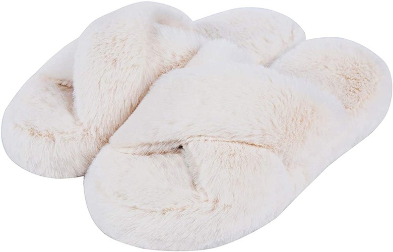 For cushion, support, and style, these cross band, fuzzy, open toe house slippers are a no-brainer. Available in several styles and patterns, this pick also has a non-slip outsole and a memory foam cushion.