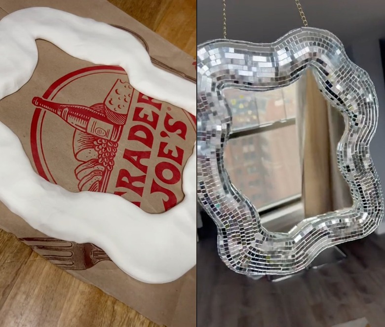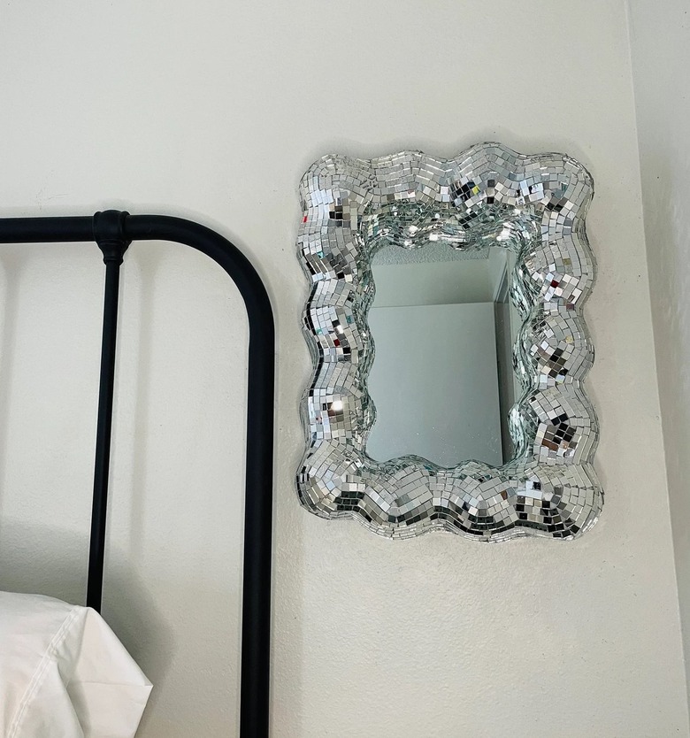 Disco ball crafter @lexiandthecity17 on TikTok makes disco-ball embellished hanging mirrors in organic, blob-inspired shapes. Using an existing mirror and then reshaping it with Model Magic, they create the base shape that they then cover in square mirror stickers.