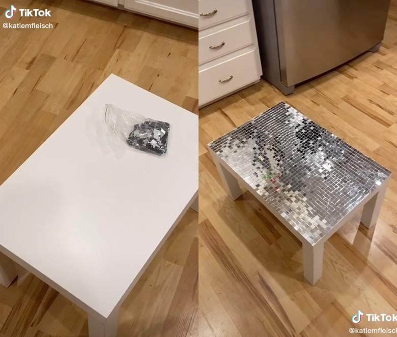 Jazzing up a simple IKEA side table with small mirror tiles is an easy, fun, and cheap hack. TikTok user @katiemfleisch demonstrates how they did this, taking a white side table from basic to party time just by glue-gunning mirror tiles to the top.