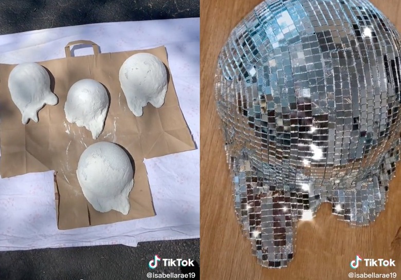 TikTok user @isabellarae19 shares her step-by-step process for making melting disco ball wall art out of foam spheres, clay, and a whole bunch of square mirror stickers. They say it took them a full week to make, but the finished product is definitely worth the time and effort.