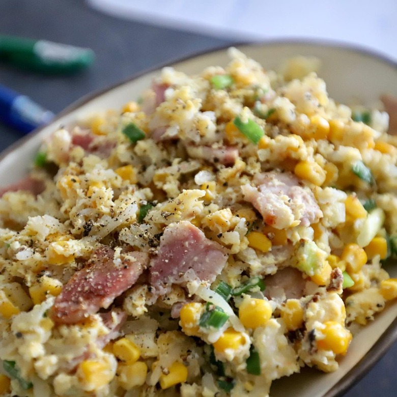 Corn isn't often served as a breakfast food, but in this dish, it's combined with some breakfast icons: hash browns, eggs, and bacon. Everything is scrambled together in a single pan for easy cleanup.