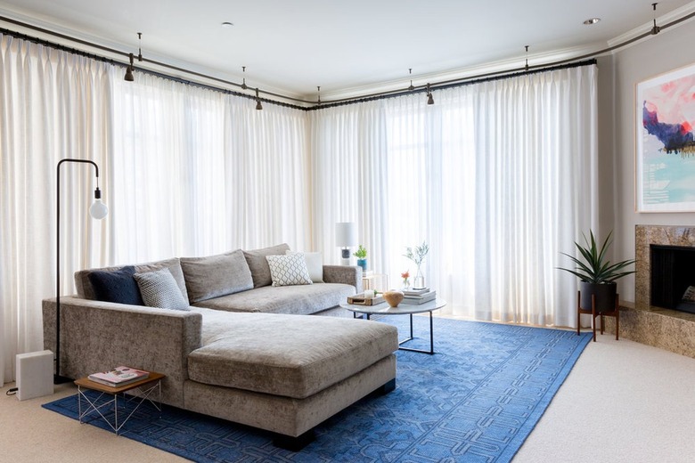 The beauty of a gray sofa is that you can experiment with bolder pieces of home decor without overwhelming the rest of your space. Jennifer Vaquero from September Workshop shows us how it's done in this dreamy living room. The overall color palette was kept neutral — including gray walls, a matching sectional sofa, and ivory curtains — so the royal blue area rug could be the focus without taking anything away from the elegant design.