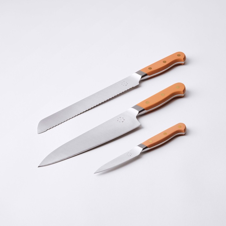 A sleek knife or two is a must-have. This set has three sturdy blades to choose from: a timeless chef's knife, a serrated blade for breads and rolls, and a paring knife for smaller jobs like cutting fresh fruit.