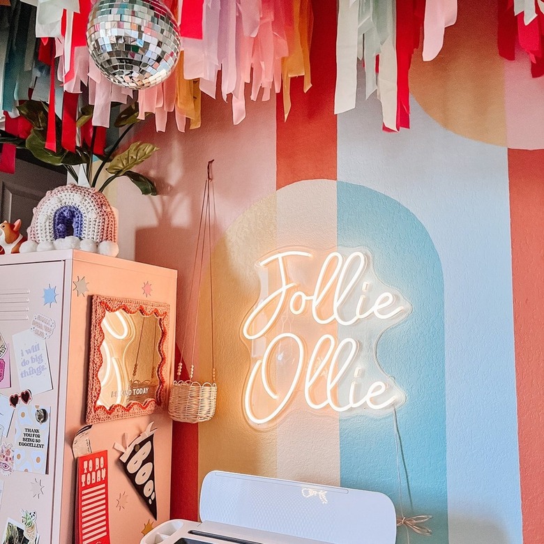 Neon art will always make a statement, and that statement is "fun and cool." Jollie Ollie Designs' studio is big fun, indeed. With a neon sign, disco ball, bright streamers, and pastel striped walls, the vibe is unabashedly maximalist and completely joyful.