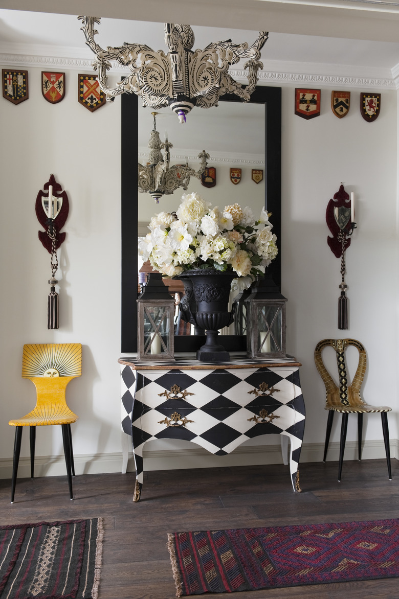 You don't need a primary color palette to bring circus-inspired decor into your home. Take this black-and-white chest, from the home of British designer Sue Timney, for example. The harlequin pattern brings to mind vintage jester costumes, turning this space into a modern medieval fantasy.