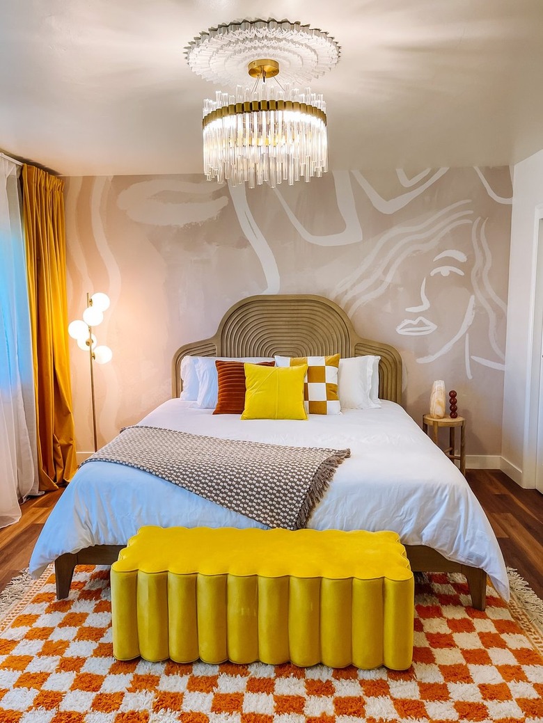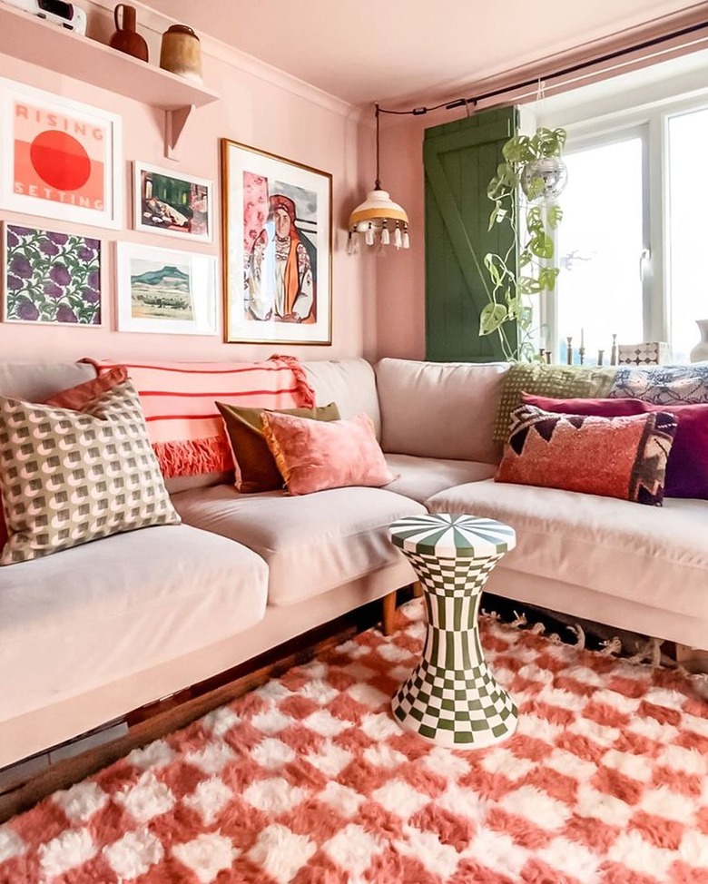 Carnivalcore or not, checkerboards are a tried and true classic, so they're a good gateway into this exuberant trend. A checkered rug adds immediate visual interest to a room, as Dani Dazey's design demonstrates. Here, she's chosen to go bold with color and scale, but a more neutral color or smaller-scale check could easily create an entirely different vibe.