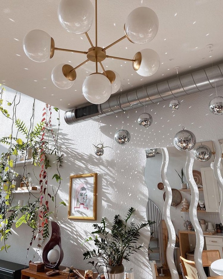 Most of us probably visualize disco balls in dark rooms, thanks to their dance hall origins. But in this space, Orlando Plant Lady shows us what a ball of mirrors can do in a room with abundant natural light. Between the many orbs and wall of squiggly mirrors, the play of light and shadow is truly enchanting.