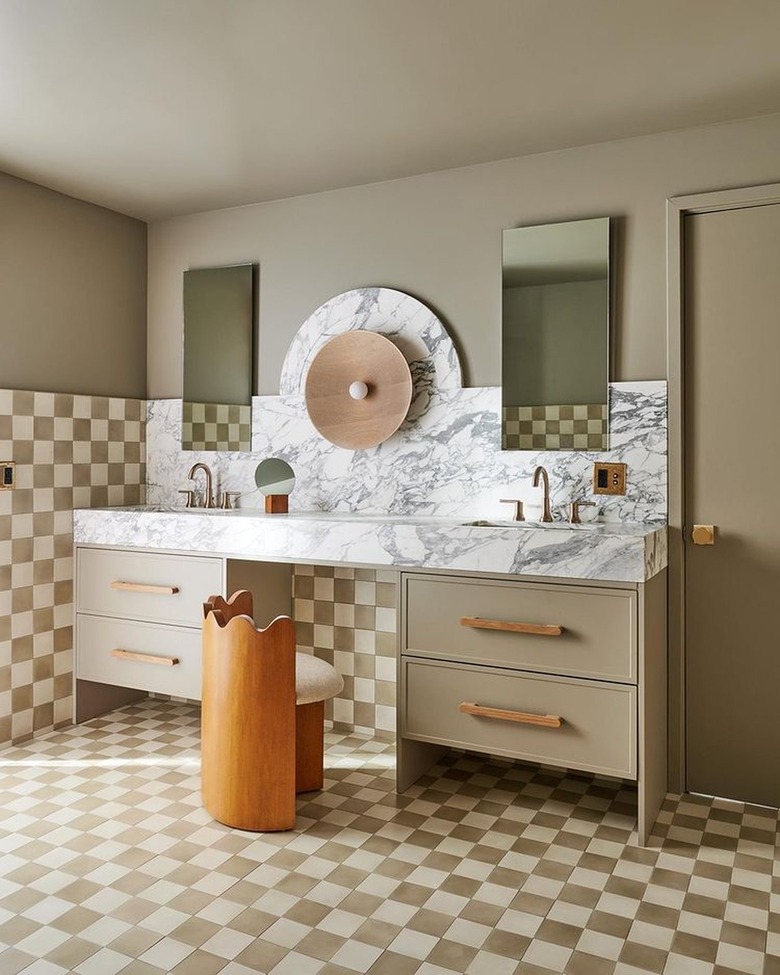 Checkerboard floors and walls? Designer Sarah Sherman Samuel goes for it here, but keeps the space from looking too busy by choosing a muted color palette and adding curved elements. Look closely and see if you can count the at-least nine curvy accents in the picture, adding up to a beautifully balanced room.