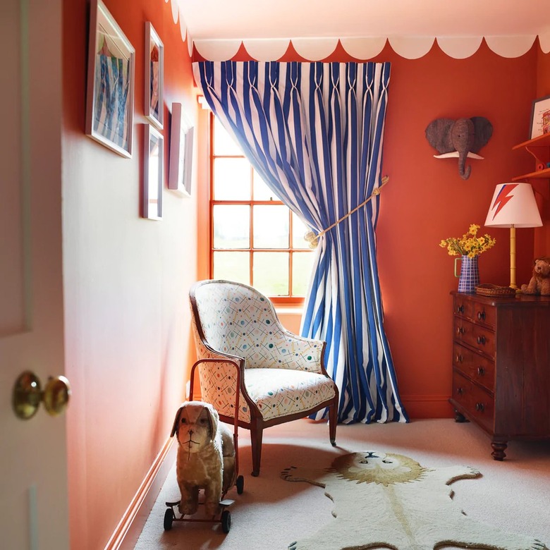 The circus theme is a classic for children's rooms for a reason. Designer Chloe Jonason of Chloe Jonason Interiors takes a literal approach to the trend in this space with circus striped curtains, scalloped paint around the ceiling, and a toy elephant head on the wall. But she also manages to offset the cute by choosing serious dark wood furnishings and a more sophisticated muted red color for the walls.