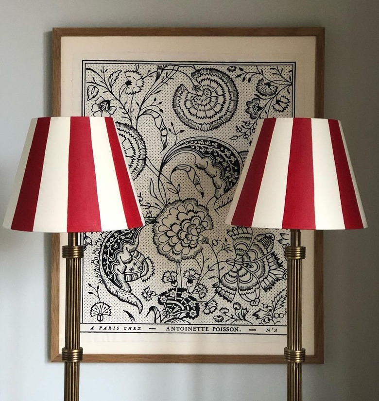 How to do red and white stripes without feeling clownish? Artist Sarah Blomfield nails it by keeping the pattern to just two little hand-painted lampshades, juxtaposed against navy floral art, for a lovely little moment.