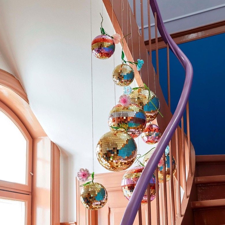 Nothing says carnivalcore more than upping the ante on disco balls from their usual silver to gold and pink. Greengate Studio suspends nine of them from a high ceiling in two sizes, and gilds the proverbial lily with artificial flowers to boot. The color-blocked banister and bright blue walls also reflect off the mirrored balls, making them look positively rainbow. Can't say we've ever seen a happier stairwell.
