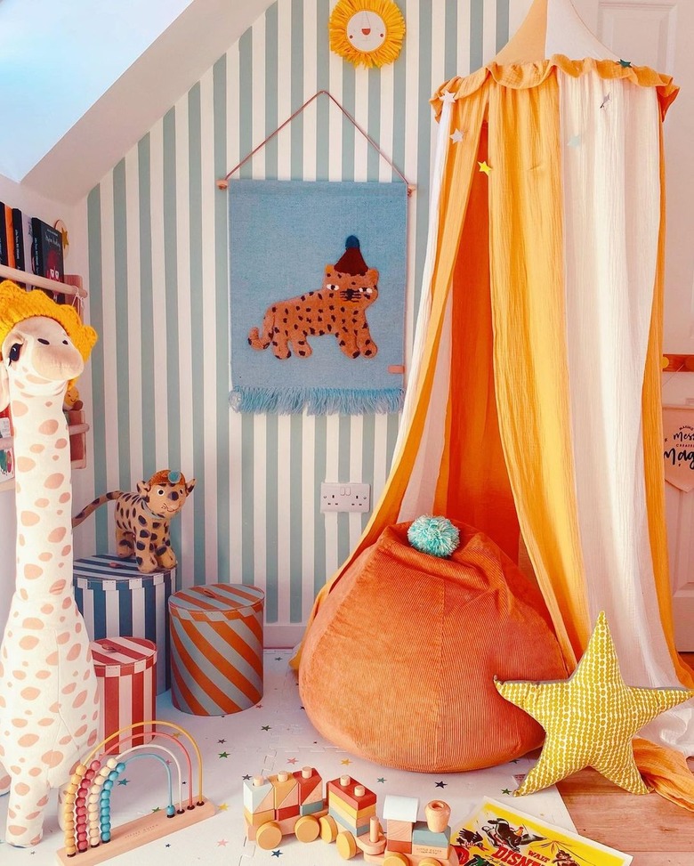 It's easier to lean all the way into a theme in a children's room. Interiors blogger Jens Den does so in this space, while still keeping it modern, thanks to a soft color palette and some retro touches. Note the pattern mixing, which also elevates the space. The tent creates a fun hiding spot for a young child, while its bold stripes play off the spots on the giraffe's neck and the rainbow-colored stars on the floor.