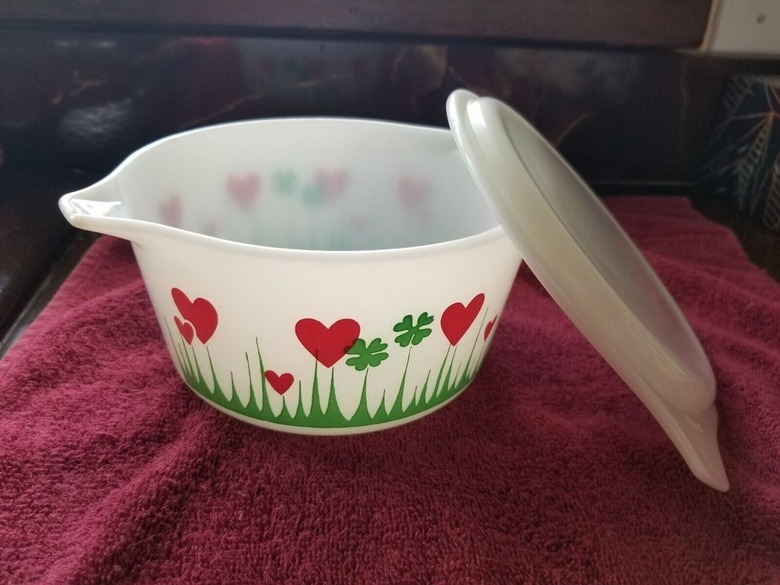 You can tell that Lucky in Love was a test or limited release because the clovers printed on the dish bleed into the hearts, so the product would not have passed Pyrex's quality standards. Yet, the design took off and, according to Country Living, the pattern was re-released for St. Patrick's Day in 2018.