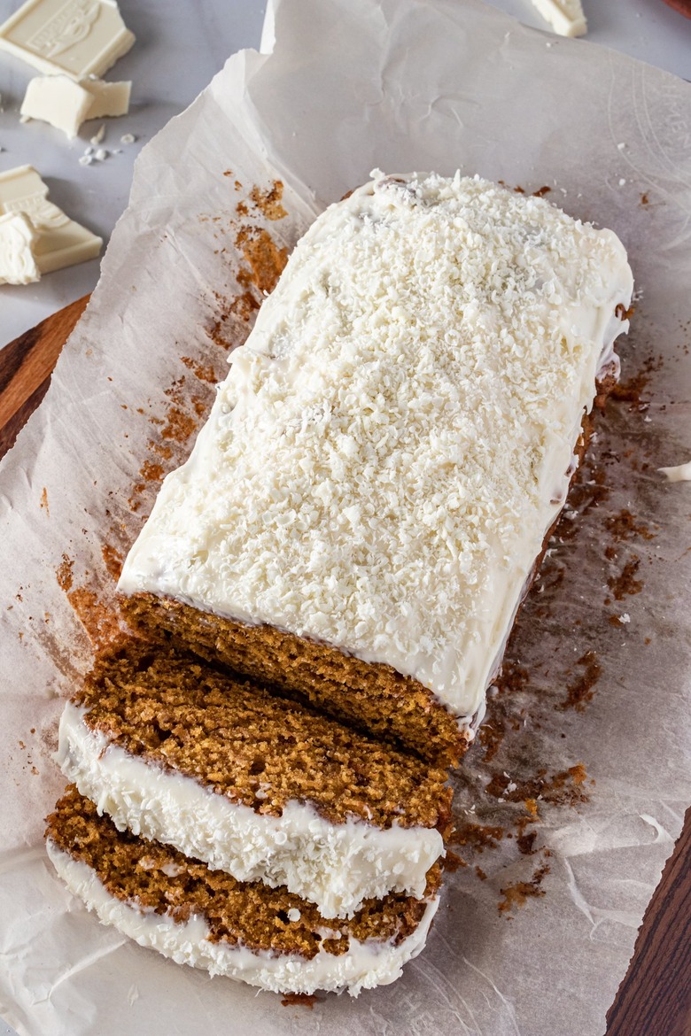 Using a cheese grater, shred the white chocolate and sprinkle it on top of the loaves.