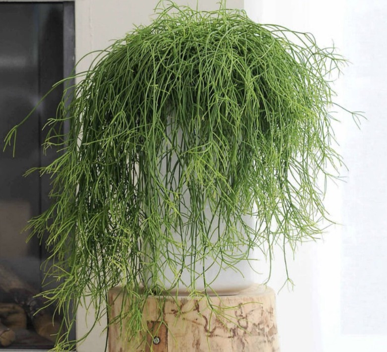 An extraordinary succulent, the epiphytic mistletoe cactus also starts small, but those who know this species would bet their bottom dollar that it won't stay that way. Sited in a hanging basket, the small stems of the cactus grow upward until they outgrow that phase and send their thick, elongated tendrils cascading down in a mass of trailing greenery.