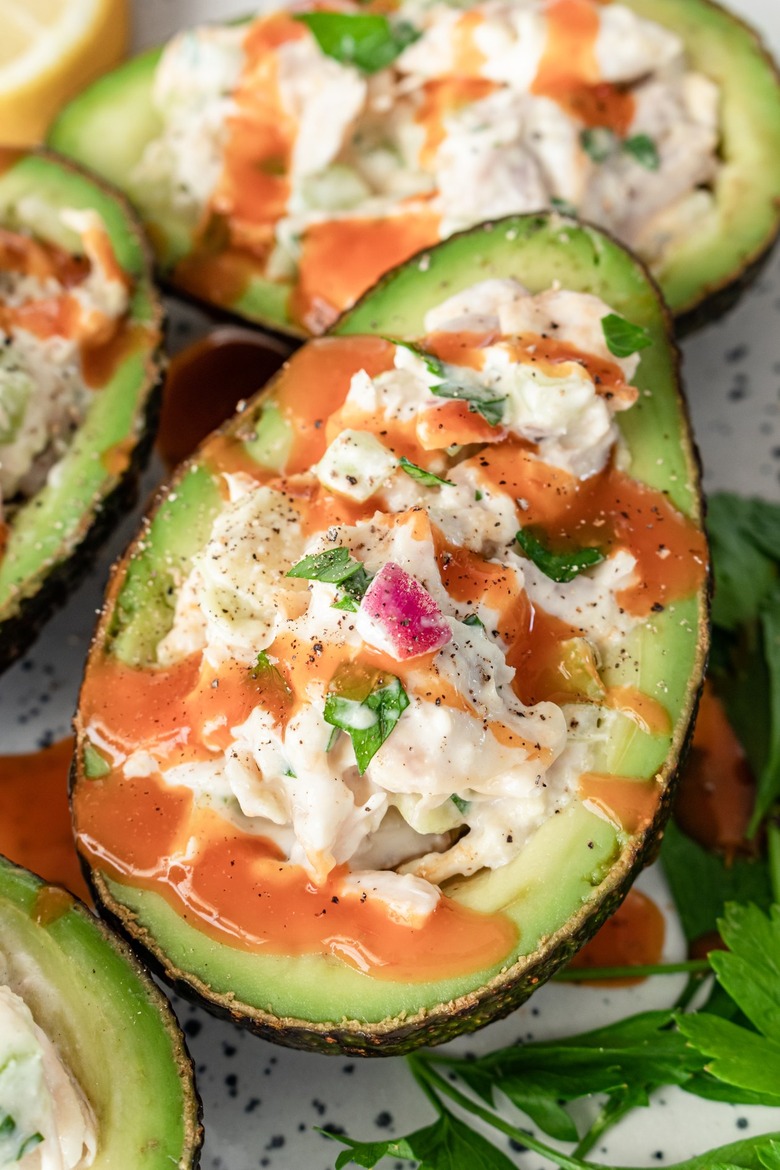 One serving equals two stuffed avocado halves. Depending on the size of your avocados — and how much you fill them — this recipe will yield two to three servings in total. Enjoy!