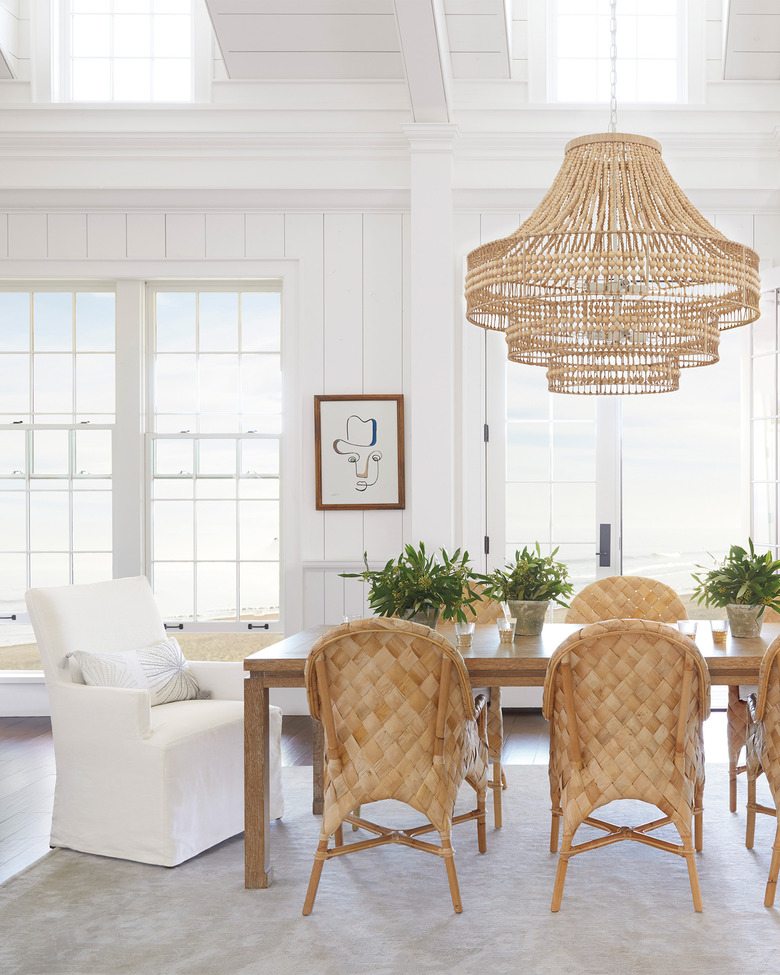 Beaded chandeliers have a similar appearance to crystal chandeliers but have a more casual vibe since the crystal prisms are replaced with beads made from materials such as glass, felt, wood, or shells. Because the beads tend to block or filter light, these chandeliers project interesting patterns or light and shadow, creating an exotic, mysterious atmosphere.