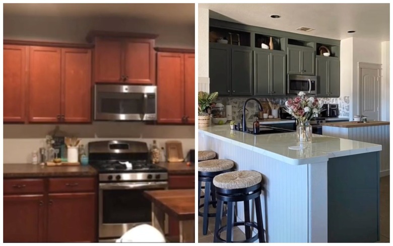 With the foundation is place, @yourlifeiswhatyoumakeit primed and painted both the plywood boxes and original cabinets using Sherwin-Williams' Pewter Green. In a comment, the DIYer also reveals that they used a paint roller and Zibra paint brush to coat the cabinet boxes. As for the doors, they were removed before being sprayed for a more even finish.