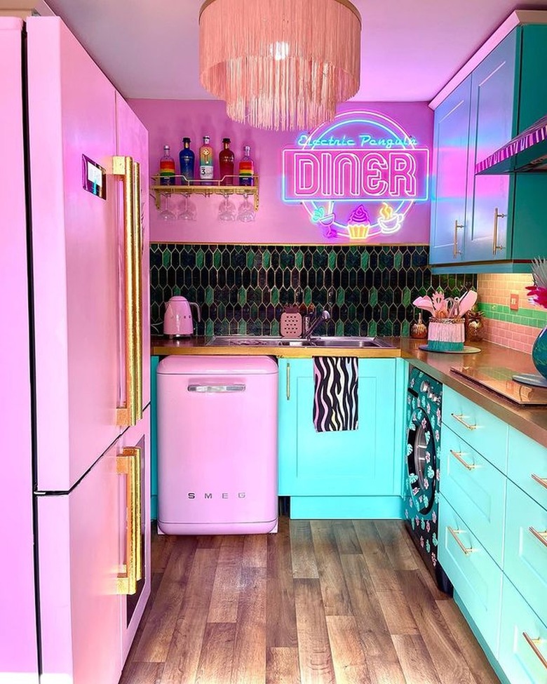 Colorful, high-gloss finishes can be key to creating the dreamlike look of the Barbiecore aesthetic. This kitchen by V of The Electric Penguin has it all: bright neon art, a saturated pastel palette, and high-shine fixtures like the cabinets in mint green and hot pink dishwasher and refrigerator. Even the kettle on the stove is glossy and pink — the attention to detail makes this space a dream for Barbiecore enthusiasts.
