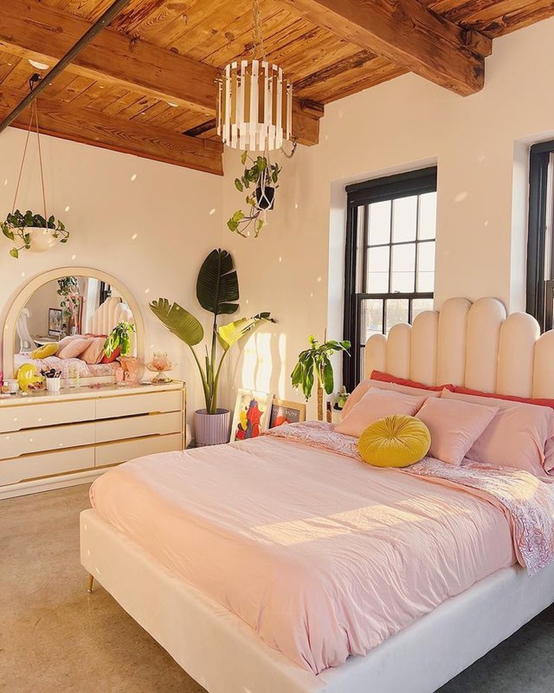 In addition to fresh flowers and floral motifs, large, leafy plants are a great way to elevate your Barbiecore home. In this bedroom designed by Kelly Marcelo, the pink bed sheet and scalloped headboard bring home the Barbiecore vibe, while the monstera and dracaena plants in the corner provide plenty of visual interest. Add a few trailing plants for extra movement and variety.