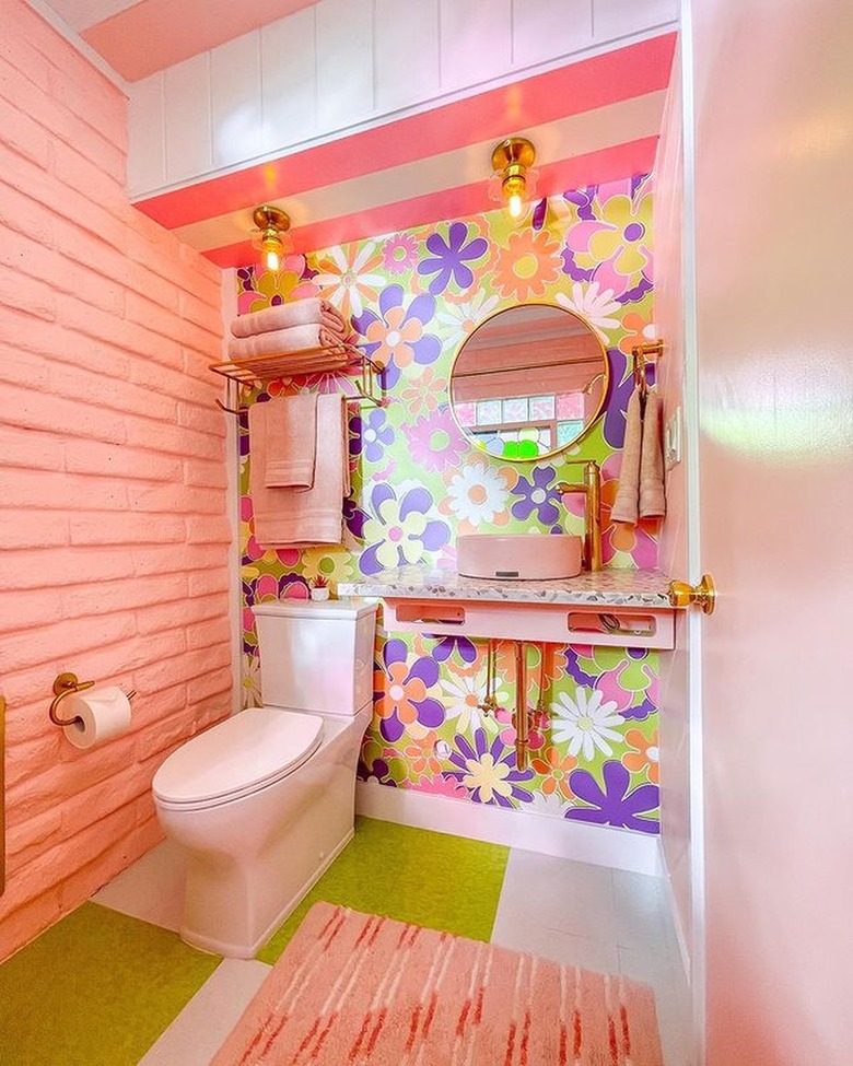 What better way to evoke the '60s, the decade in which Barbie came of age, than with some retro floral prints? This adorable bathroom designed by Dani Dazey shows how it's done: The bold, pastel floral wallpaper contrasts nicely with the blush accent wall and adds a sense of whimsy. The striped floor mat provides visual movement, and the gold details like the faucet and light fixtures tie the room together.