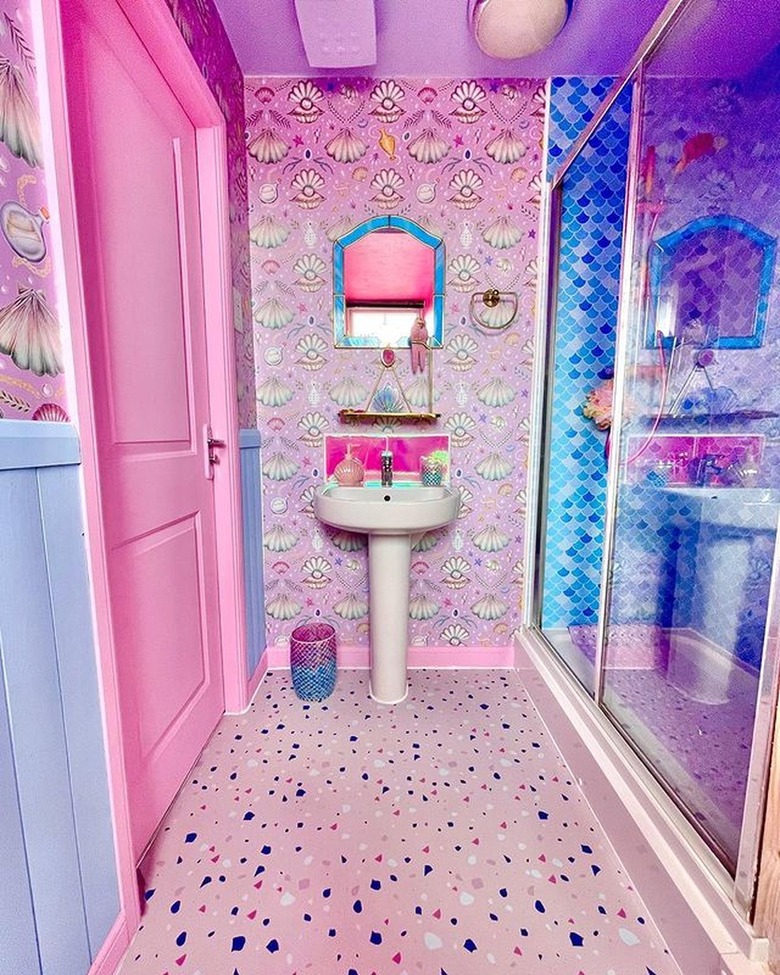 With her iconic style and boundless optimism, Barbie encourages us to have fun and live life to the fullest. And what's more joyful than colorful prints? This vibrant bathroom designed by V of The Electric Penguin shows us how bold wallpapers can transform a space. The pink shell-print wall covering is peak Barbiecore, while the pebbled shapes on the terrazo-patterned floor bring the seaside straight into your home. The blue and white tiles in the shower will make you feel like you're frolicking in the ocean.