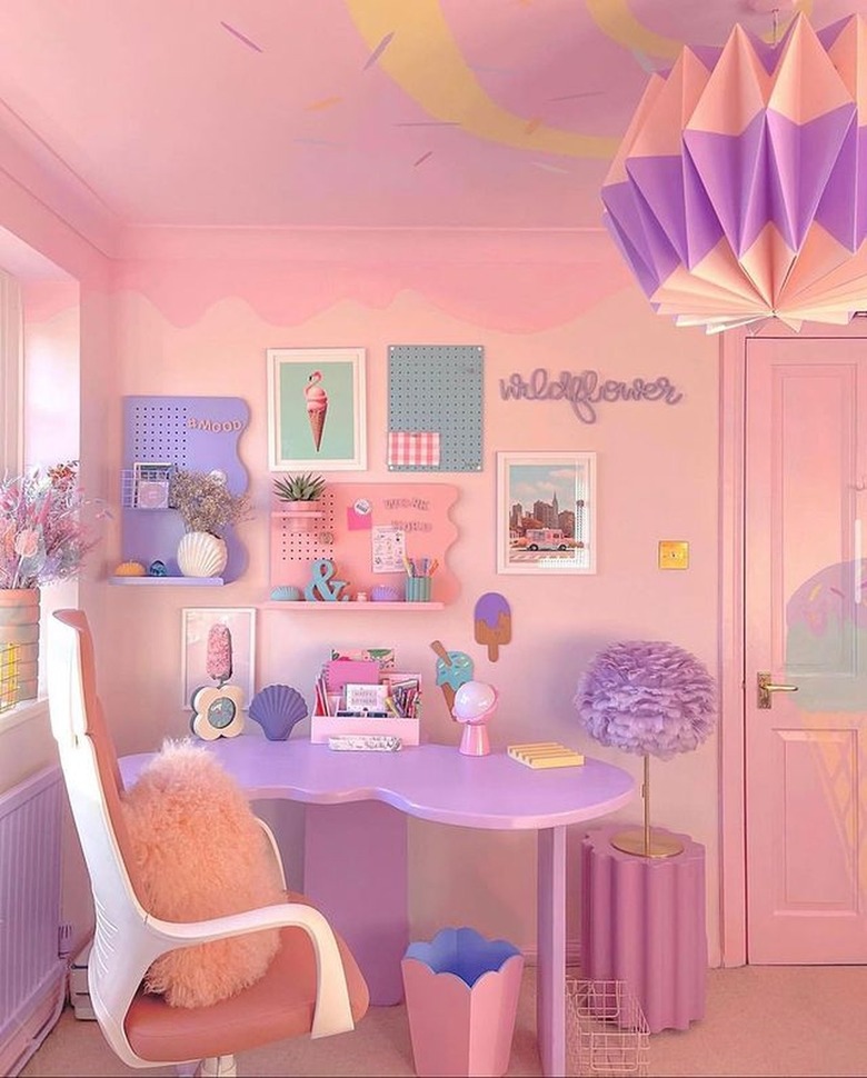 Barbiecore decor is all about celebrating the sweeter things in life, and this pink home office designed by Sophia of This Colourful Nest shows us how fanciful artwork can help achieve the look. The ice cream-themed wall art highlights the playful nature of the space. The pastel color scheme, soft textures, and fun shapes — like the curved desk and pegboards, scalloped trash can, and origami-inspired pendant light — all work together to help the room exude joy and happiness.