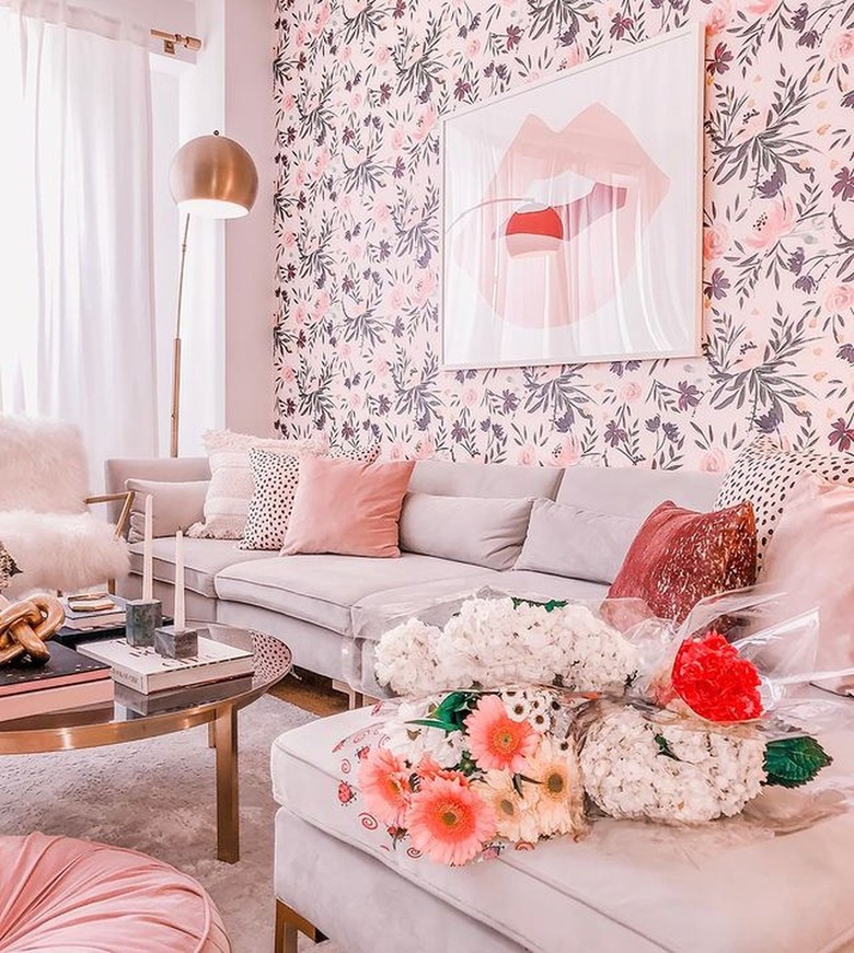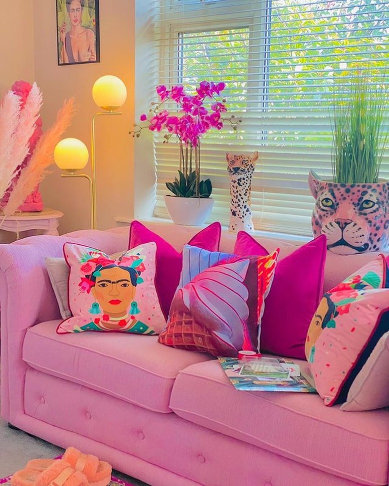 What's more vibrant than a bouquet of fresh flowers? To really capture the essence of Barbiecore, go for bouquets with focal flowers that are pink, red, or purple, and white filler flowers. Just look at this living room designed by Danielle Tullo La Testa — the bouquet adds variety to the neutral palette and pairs nicely with the botanical wallpaper. To give the space some edge, display a few cushions with bold animal prints.