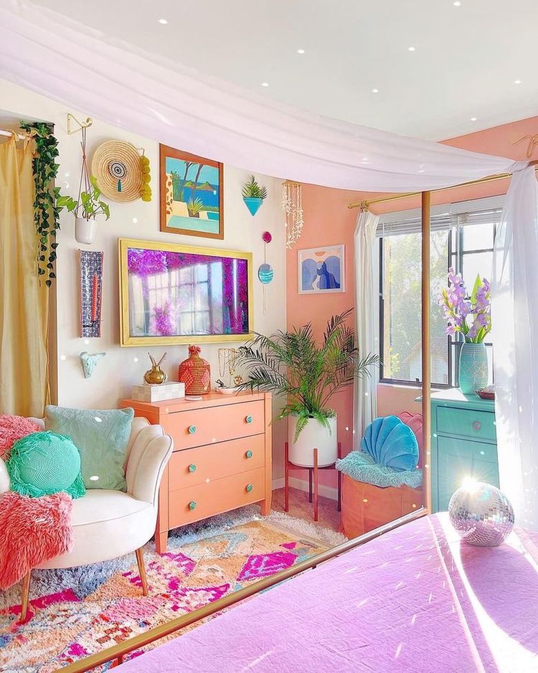At its heart, Barbiecore is just like its namesake doll: colorful, fun, and a joy to be around. Hallmarks of the aesthetic include hot pink; accents in aqua, lilac, and gold; large-scale floral prints; and scallop or heart motifs. Take the bathroom above, designed by Jay of Paint the Town Pastel, as inspiration. The blush and robin's egg blue color scheme feels straight out of a vintage Barbie Dreamhouse, while the clawfoot tub and scalloped wall look both glamorous and playful.