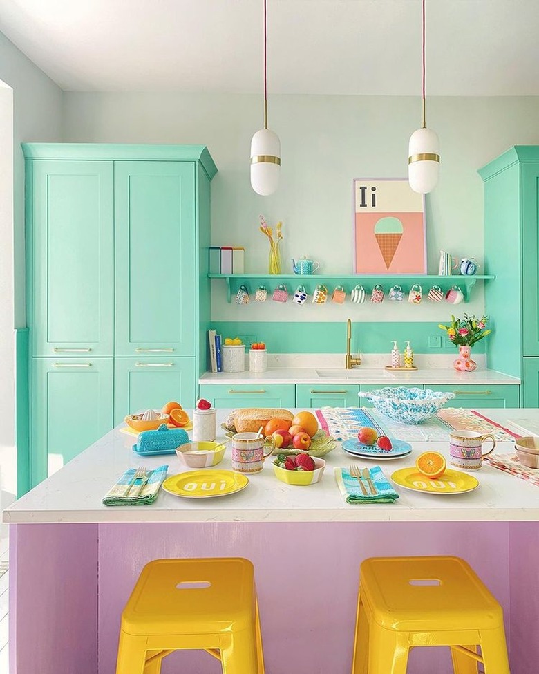 Even if pink isn't your thing, you can still achieve the Barbiecore look with a soft pastel palette. This kitchen designed by Jay of Paint the Town Pastel is dreamy as can be — the mint green cabinets paired with off-white walls create a refreshing, summery look, while the bright yellow barstools offer visual balance. The ice cream print brings just the right amount of playfulness, and the light purple kitchen island back panel softens the room.