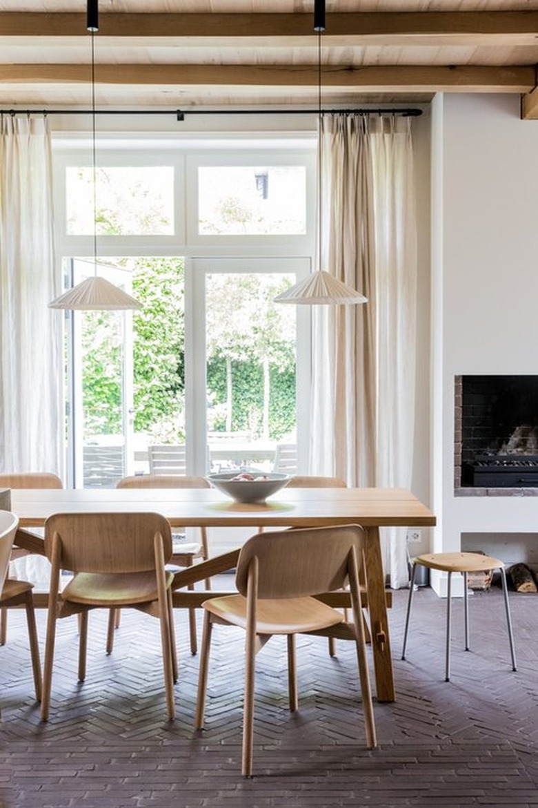 For a light and airy tonal approach, pair beige walls with cream curtains à la this dining room by Avenue Design Studio. The light wood ceiling and matching wood furniture brings out the warm undertones present in the two neutral colors. The result is an elegant and serene setup that will make dinner parties that much cozier.