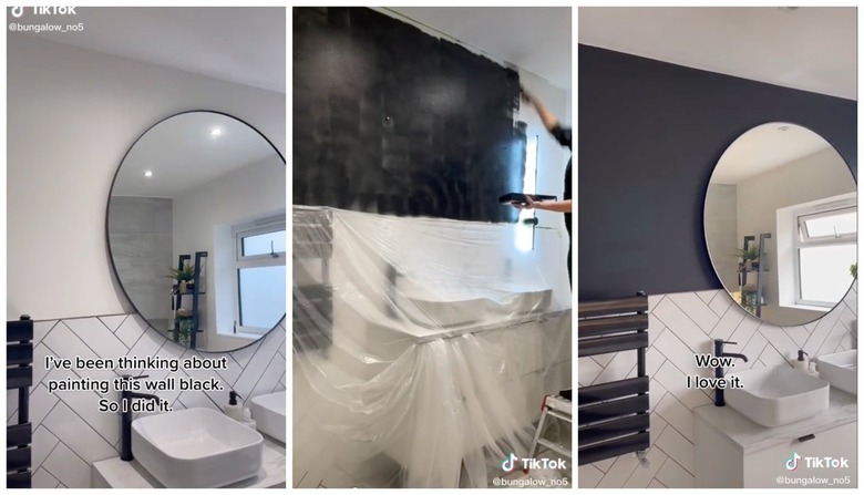 Experimenting with black paint doesn't have to be dramatic. As @megs.house on TikTok shows, a simple upper black accent wall can make a difference in a bathroom, adding contrast to both white tile and furnishings. Plus, black won't display debris as glaringly as white does.