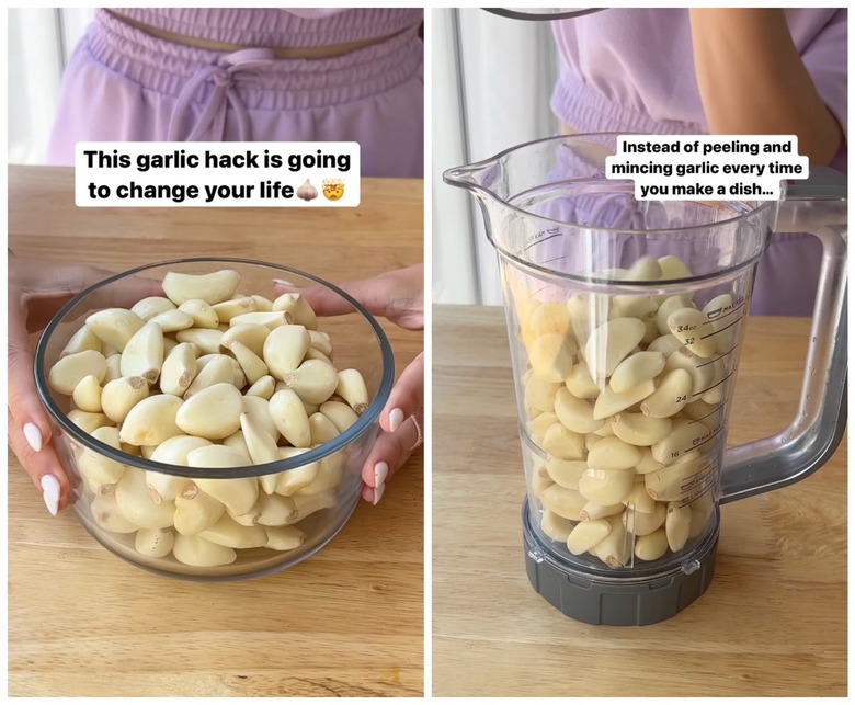 The creator begins by taking a bowl of peeled garlic cloves and adding them to a blender with a little olive oil. This will turn the garlic into a paste — similar to what you may see in the jars at the grocery store. They also suggest adding in some fresh herbs if you're looking for extra flavor.