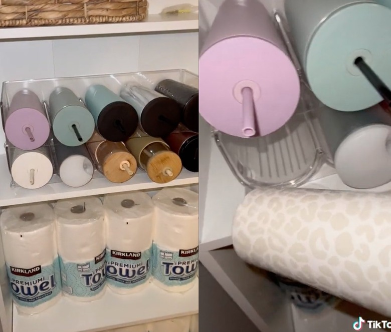 TikTok user Noelle of @jettsetfarmhouse has devised a clever way to solve this problem, using a lucite bottle rack from mDesign on Amazon that's the perfect size for keeping water bottles and tumblers of various sizes neat and tidy.