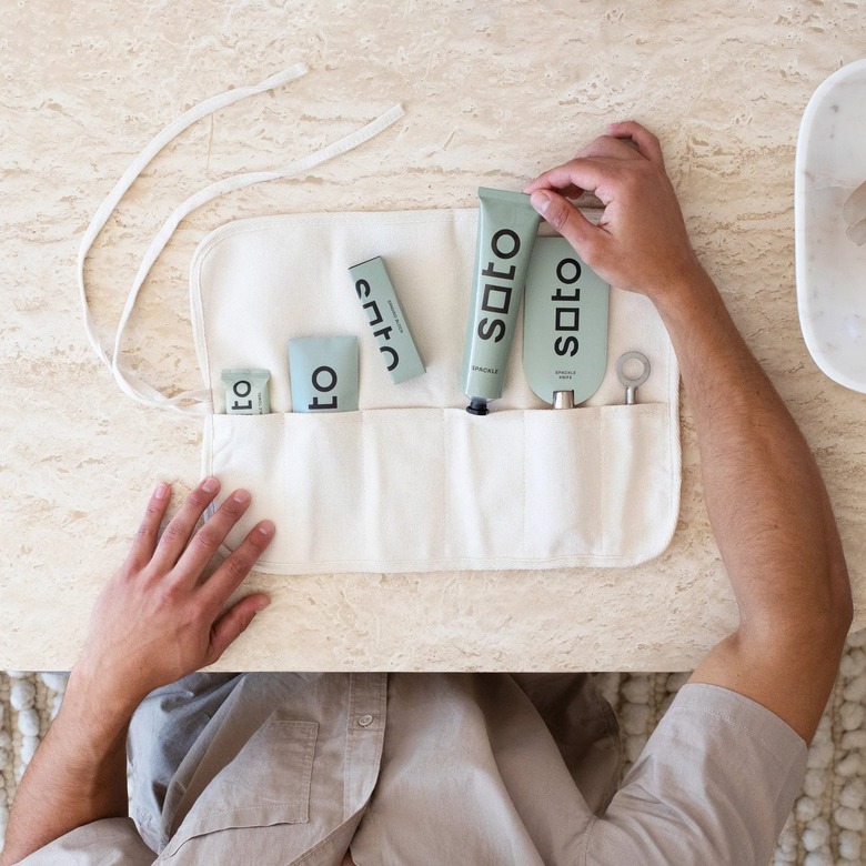 The paint pros over at Soto have met this problem head on, developing their very own Premium 7-Piece Spackle Nail Hole Filler Kit. The kit includes spackle, a spackle knife, a sanding block, a tube key, a towel, gloves, all smartly stored in a savvy canvas rollup case inspired by artists.