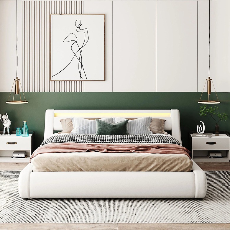 If you love the soft frame design but with an edge, you need to check out this Wayfair bed. It's upholstered in leather and has a built-in LED light with 16 color options on the headboard. Plus, it can lift up to reveal extra storage.