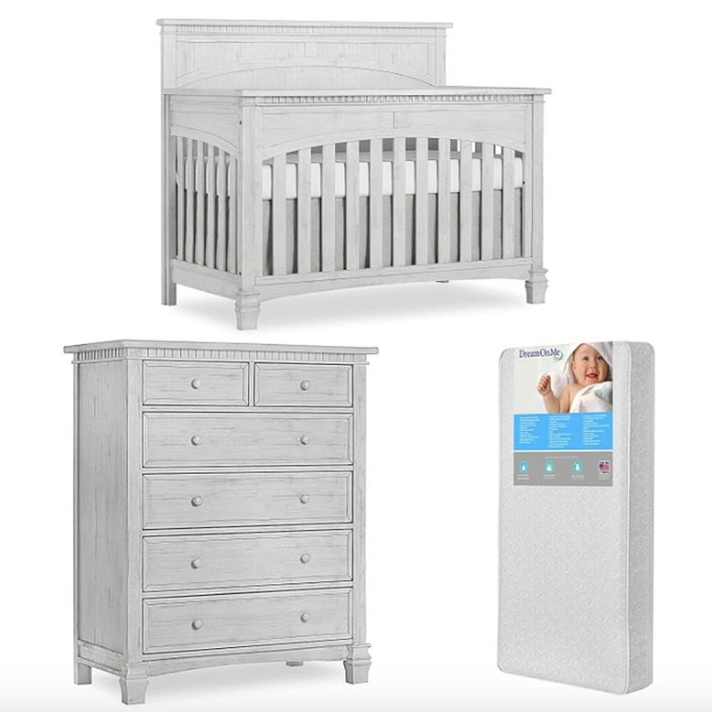 Bundle your crib with a mattress and a five-drawer dresser when you shop this three-piece pairing on Amazon. The Evolur nursery set is finished in a neutral light gray and features detailed molding on the crib. To make your life easier, it includes a Dream on Me mattress, meaning all that's left to do is find the sheets.