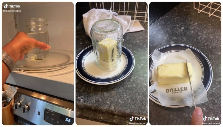 Pour water into the jar, then heat it in the microwave for about two minutes. Dump out the water and turn the vessel upside down, covering your cold butter. (Another option is to boil water on the stovetop before pouring it into the jar.) The butter will soften in about five minutes.