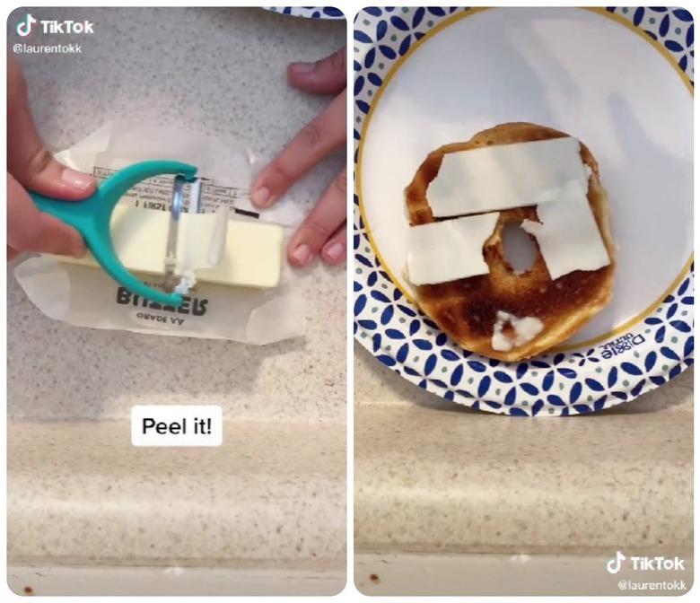 Similarly, you can slice cold butter into thin strips using a vegetable peeler. The thickness of each strip will be just enough for foods like bagels, toast, and waffles. Not to mention, peeling butter is much faster than slicing multiple pieces.