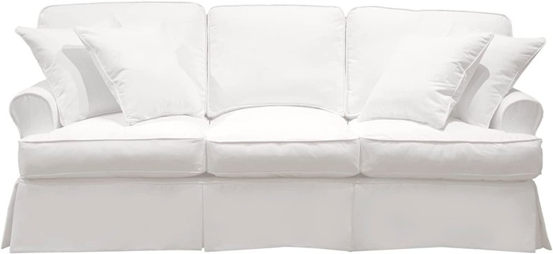Nail the balance of a polished-yet-cozy living space with a couch that looks equally elevated and inviting. This sofa masters it with plush cushions and a charming skirt (a staple in coastal grandmother style) — finished in a crisp white shade. Don't let the color scare you away though; the slipcovers are removable and machine washable.